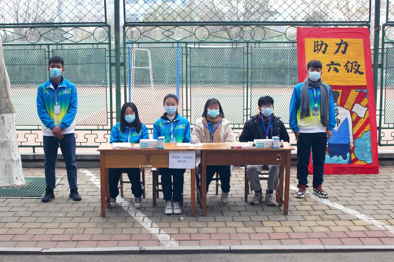 学生会的成员们早早来到考场外,放置展板、摆放桌椅,口罩、耳机、铅笔、橡皮……一件件崭新的考试用品正等待着需要的人前来领取。工作人员们为考生们提供热情的服务,并为他们送上美好的祝福。