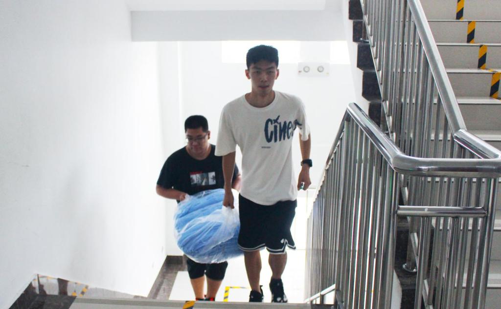经过细致的清点,工作人员明确分工、迅速行动,两人成组、互相协作,有序将用品搬运至楼道并堆积整齐。随后,在相关负责人的指挥下,工作人员逐一为各宿舍发放用品。