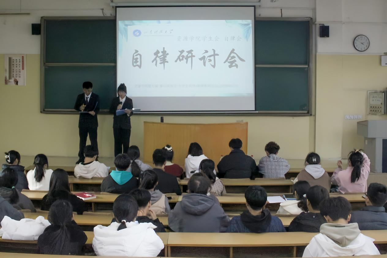 在5#206举办第七届“泰山我敢当”大学生自律•和谐系列活动之行为规范自律研讨活动,学院2022级学生以班级为单位参加。