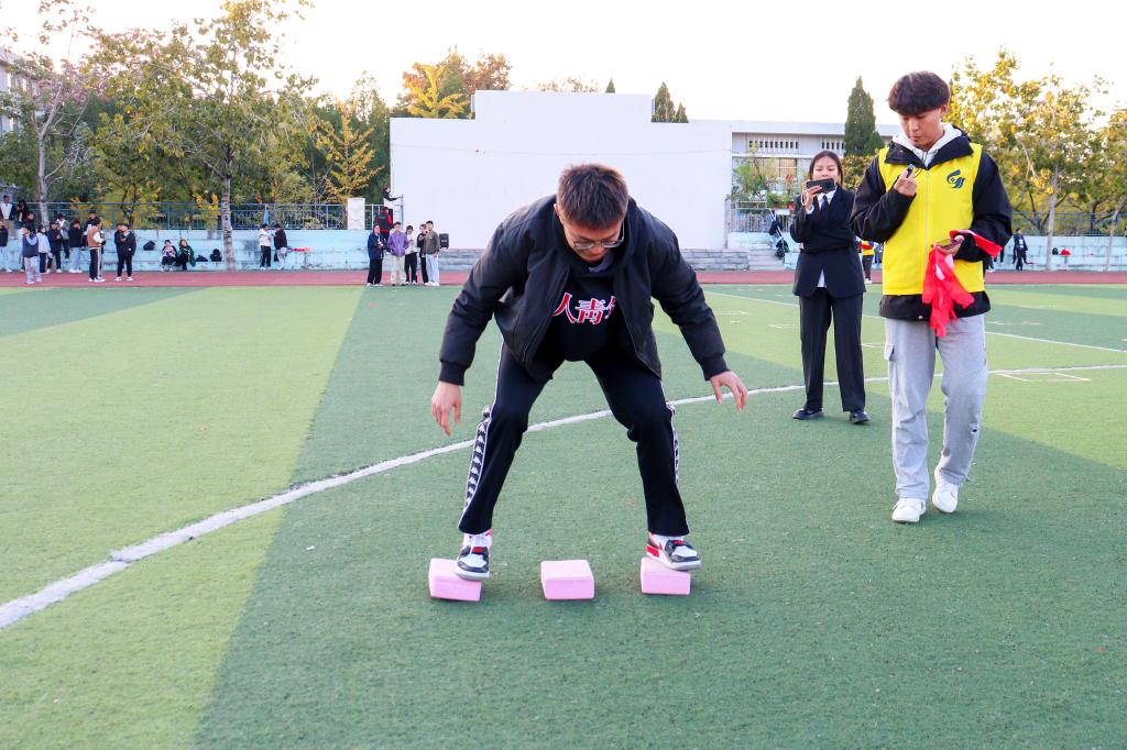 “十人九足”环节中,20名同学排成一横排,相邻两同学将腿绑在一起,大家步调一致,“一二一二”的口号声响彻操场上空。在“跳大绳”环节,两名同学甩绳,15名同学排成一纵列站于绳一侧,在跳动中尽情挥洒青春汗水。在“气球传纸杯”环节,同学们吹起气球,用嘴巴含住将气球撑起的纸杯在多名同学间传递,大家配合默契,轻松完成挑战。在“过河拆桥”环节,每组三块砖,手脚不碰地,全程借用这三块砖前进,携砖前进完成规定路程,并传递给下一名接力的同学。比赛中,大家手脚配合协调,迅速敏捷地完成接力挑战。