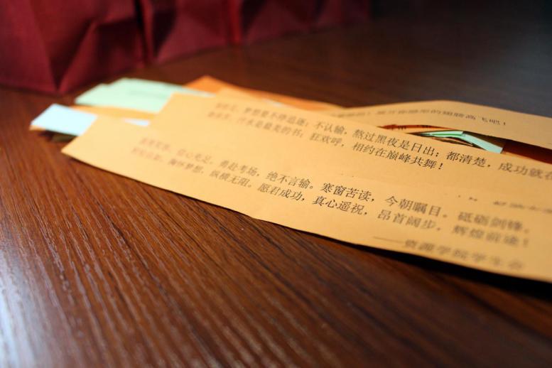 “不服输、熬过黑夜是日出”“愿君成功,真心遥祝,昂首阔步,辉煌前途”……纸条窄窄,话语温暖,以笔笺心,以书传情,学院学生会组织策划忙碌同时不忘学长学姐送去暖暖文字祝福