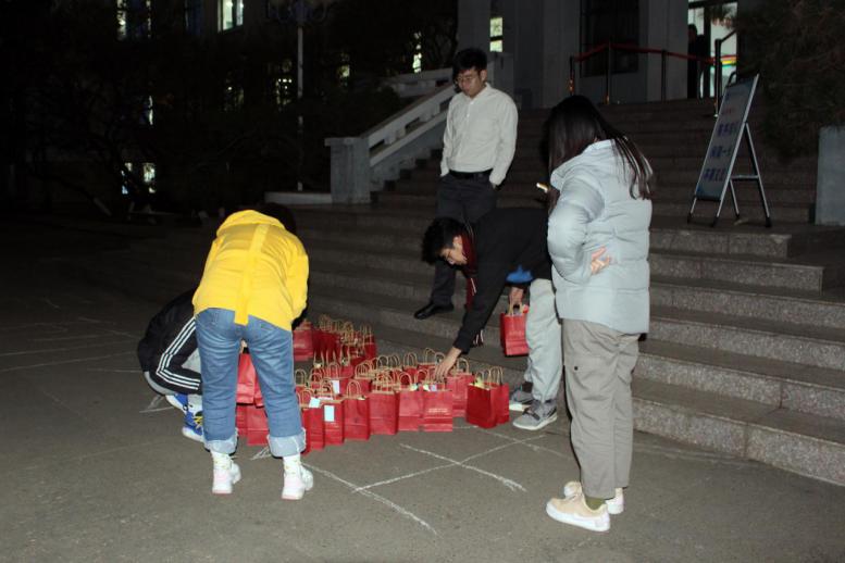 夜色深沉,学院学生会成员不畏严寒,依旧在教学楼前摆放福袋,只为明早的第一缕阳光照射大地时,考研学子看到此情此景,能够会心一笑。
