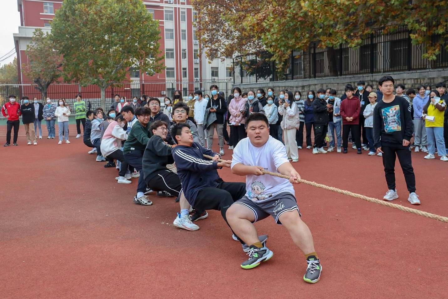 11月13日,紧张焦灼的比赛氛围再次点燃了同学们的热情。其中,以工程管理2020级6班和工程管理2021级6班的四强晋级赛最为精彩。随着一声哨响,工程管理2020级6班参赛队员紧紧地握住麻绳,他们个个咬着牙,身子向后倾,一鼓作气,以力量优势赢得了第一局比赛的胜利;工程管理2021级6班参赛选手改变策略,调整靠绳位置与姿势,消耗对手体力,赢得第二局比赛胜利;在最后一局中,红布条在中间线上左右晃动,比赛场面激烈异常,工程管理2020级6班参赛队员双手紧握绳子,咬紧牙关,奋力拉扯,拼搏到底,最终赢得了比赛的胜利。