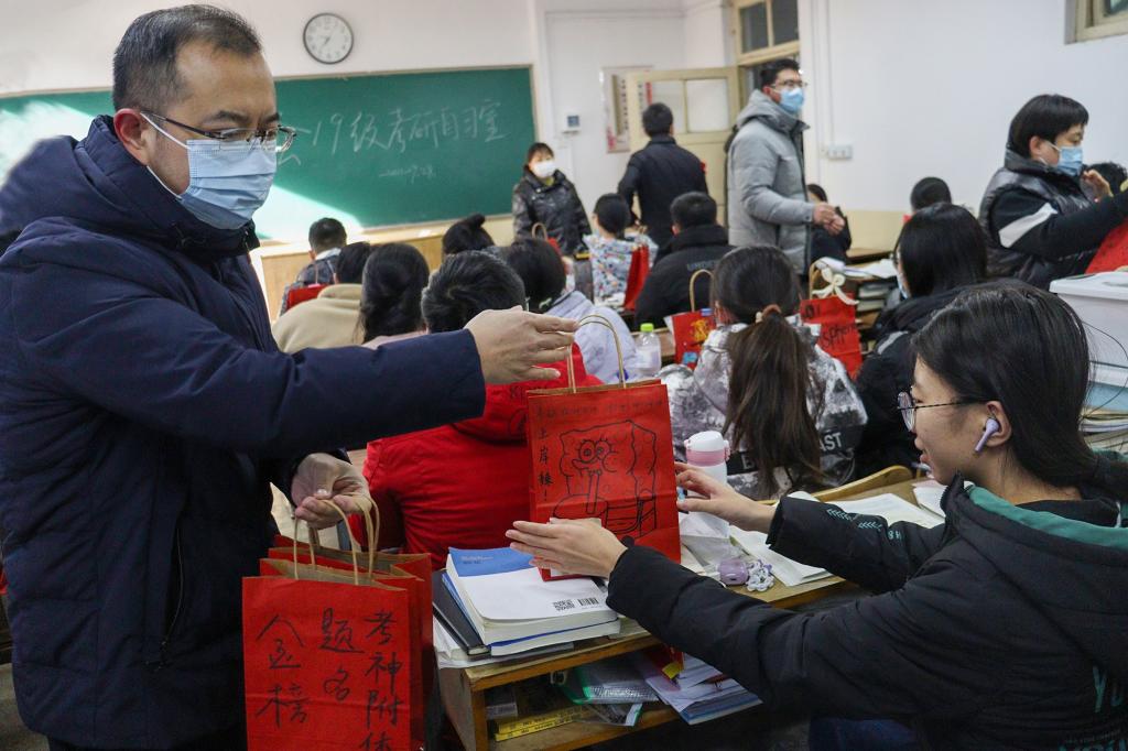 领导、全体辅导员老师手提福袋,来到考研自习室,将福袋发放到每位考研学子手中,在寒冷的冬日给考研学子们送去暖心关怀。