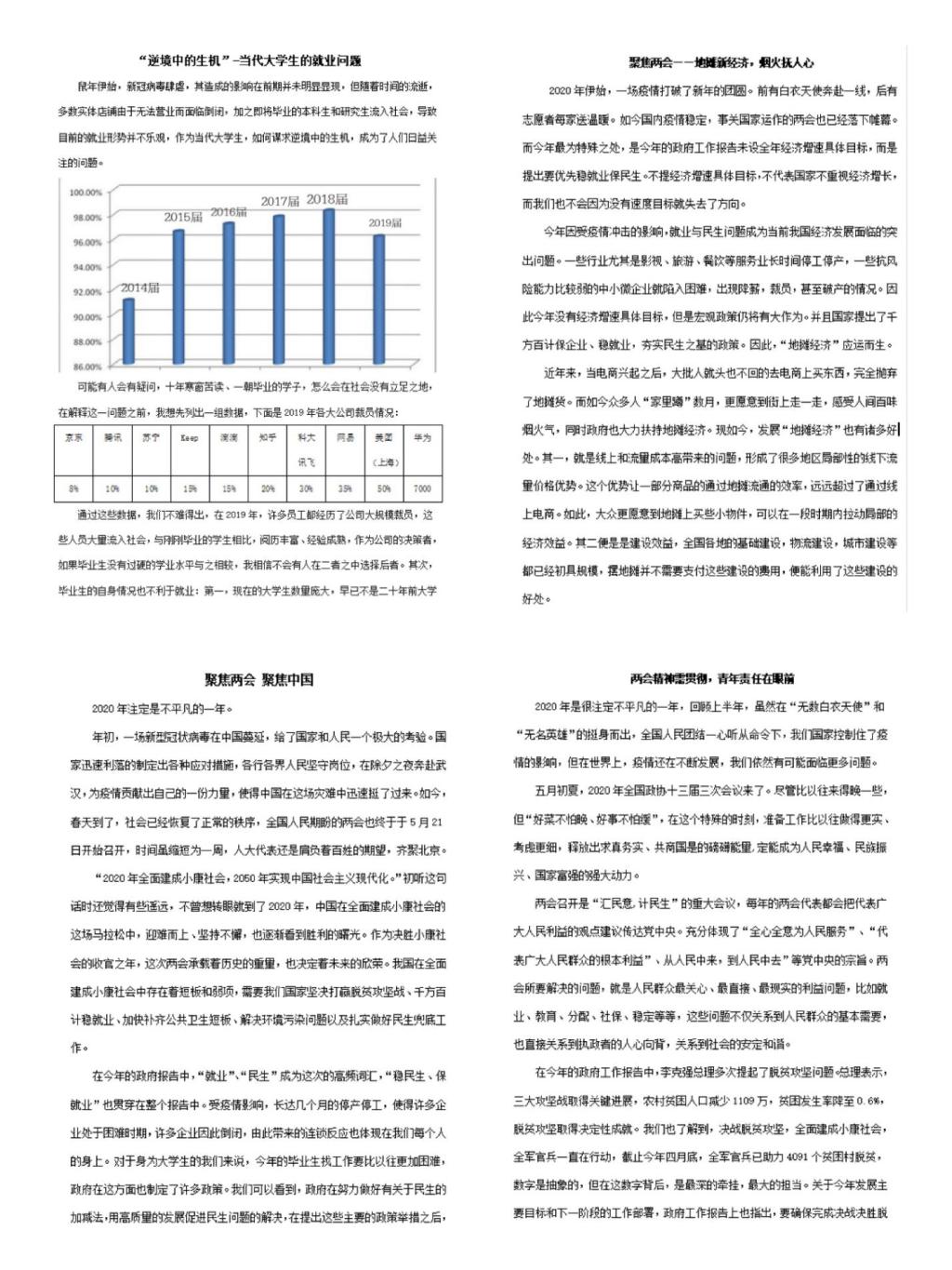 学子期间持续关注两会动态,深刻思考两会议题,积极参与征文投稿,畅谈自己的学习心得体会,围绕民生保障、就业创业、经济发展、疫情防控、脱贫攻坚等两会热点话题各抒己见,结合时代背景对两会精神内核与当代青年的使命担当进行深度思考,言辞真切、实事求是,其中涌现出大量优秀作品。
