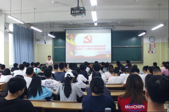 学工办主任、团委书记洒艳走上讲台,为全院学生党员作党史学习教育专题宣讲。