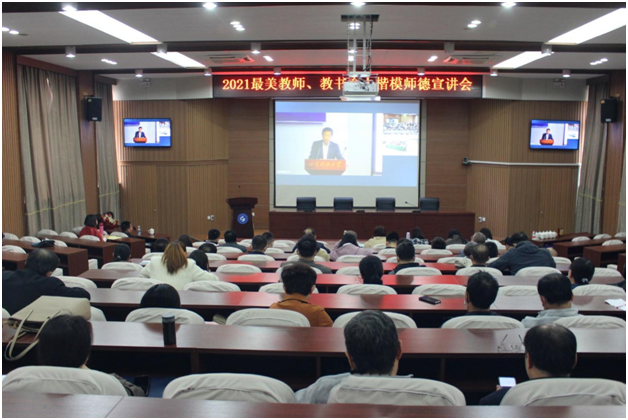 “山海泉”师德宣讲团成立大会暨“2021最美教师、教书育人楷模师德宣讲会”上作报告,于泰安校区分会场1号楼报告厅作线下宣讲。泰安校区教师代表线下聆听了王清标院长的报告,线上观摩了宣讲会全程。