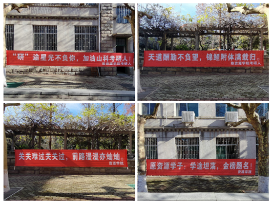 “道阻且长,行则将至”“以梦为马,不负韶华”“天道酬勤不负众望,锦鲤附体满载而归”……林荫道、行路旁,一句句祝福印在横幅,更映在心中。资源师生为考研学子条幅签名,将无限祝福浓缩镶刻在字里行间。