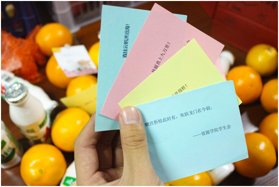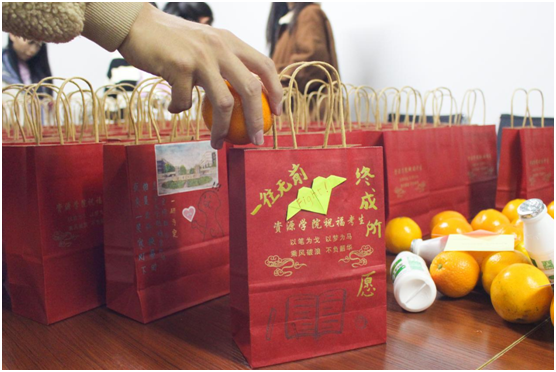 苹果寓意“苹”安上岸,橙子代表心想事“橙”,文具套装助力下笔有神,暖宝宝驱散严寒,祝福卡片承载来自全院师生的殷殷心意,牛奶帮助同学们开启元气满满的每天……从前期礼物设计、挑选,到后期福袋制作、打包,酷爱成人网