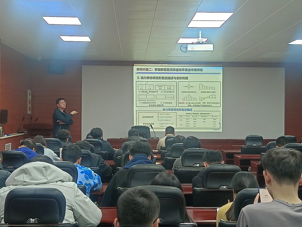 研究生作“强震区穿越断层隧道非连续界面应力波传播模型与抗震材料特性研究”学术报告,学院相关专业研究生参加。