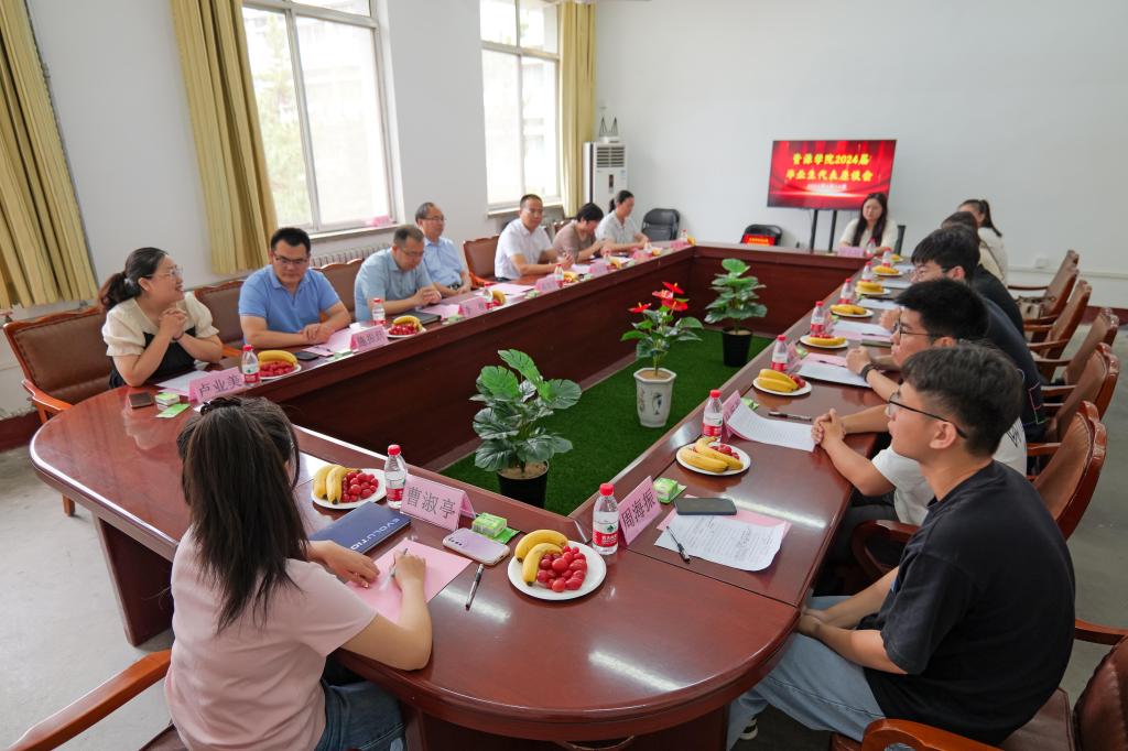 在1A214召开2024届毕业生代表座谈会。学院党委书记高尚宇,党委副书记、副院长程家国,副院长李楠,学工办主任、团委书记洒艳,毕业生辅导员以及任课教师代表出席会议。