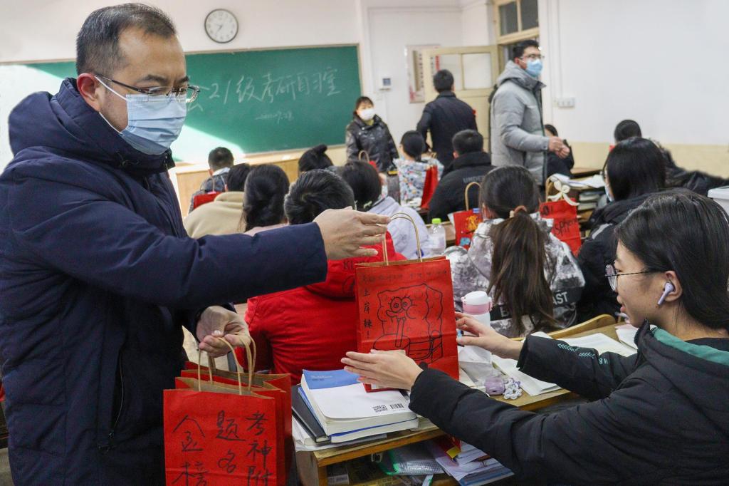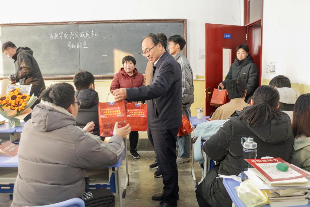 清晨,学院领导和老师们手提福袋,轻轻走进考研自习室,将这份沉甸甸的心意送到学子们手中,为考研学子送去暖心关怀。防灾减灾科学与工程2021级1班范丙珂说:“我大一的时候也曾经亲手做过福袋送给学长学姐,现在又收到了来自学弟学妹的祝福。这不仅仅是一个福袋,更是学院一届届学子的传承,是学院对我们的关心与支持,让我在这漫长的备考路上充满力量。相信有学院、老师和学弟学妹的鼓励,我们必能披荆斩棘,一战成‘硕’!”