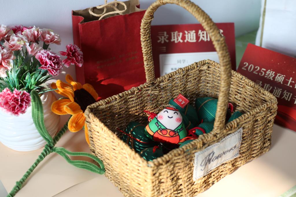 精心组织,用心策划,为2025届毕业生设计了包含“九个一”在内的考研大礼包,即装满一个福袋、送上一份祝福、制作一张贺卡、领取一块祝福牌、留下一张合影、抽取一次盲盒、送上一杯热茶、摆放一对展板,挂上一对高“粽”。