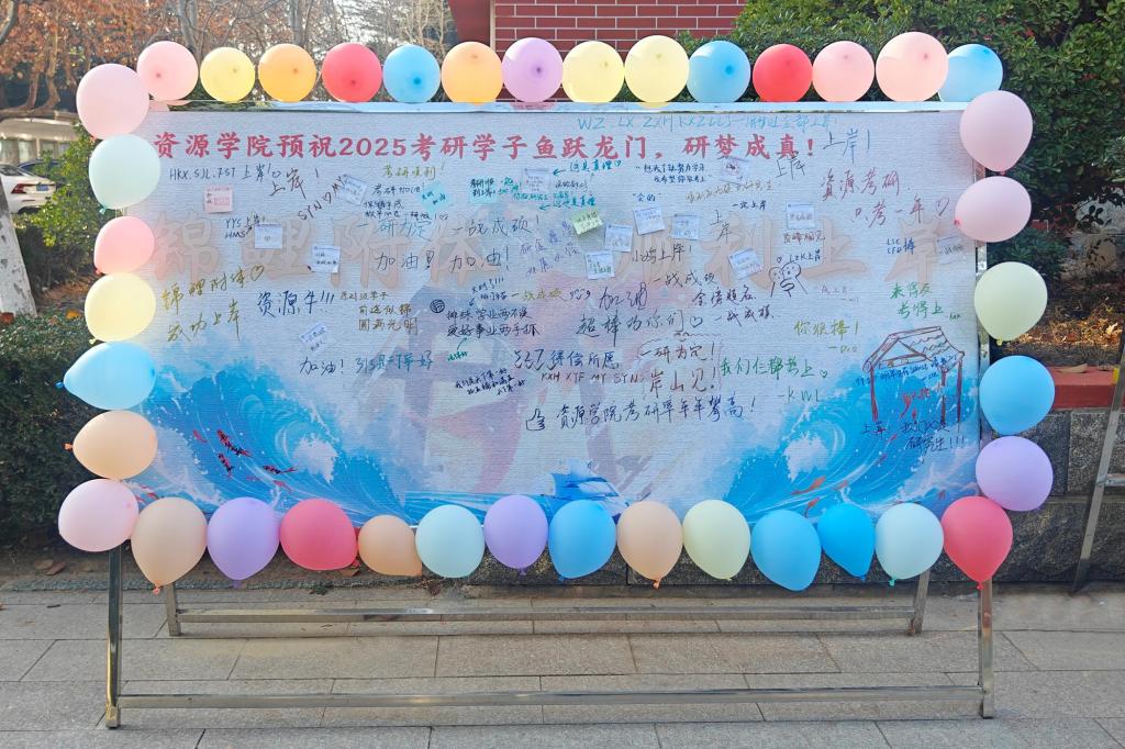 锦鲤附体,寓意着考研学子逐梦前行,好运连连;祥鹤高系,象征着他们青云直上、顺遂无虞……两块展板写满了对考研学子梦想成真、未来光明的美好期许。“梦想在前,无畏奔赴”“愿学长学姐们旗开得胜!”“考研必胜,平安喜乐!”……学院领导、老师、同学们在展板上写下对考研学子的美好祝愿。