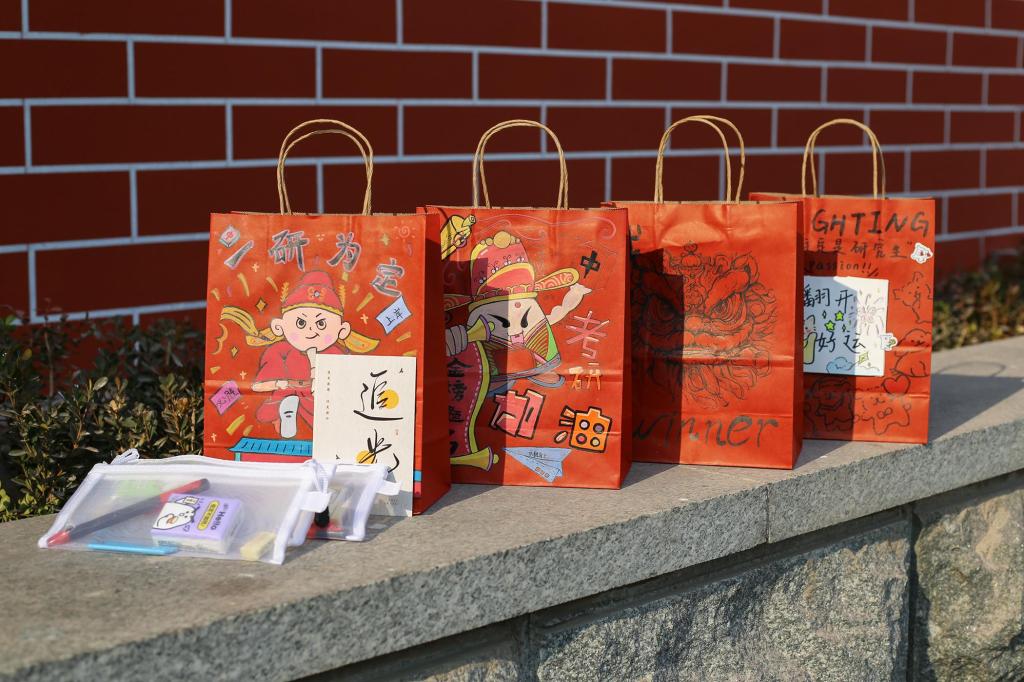 福袋内,寓意平安上岸的苹果散发着诱人的果香,实用的文具套装是搭建知识堡垒的得力武器,温暖的暖宝宝在寒夜中传递着贴心的关怀,甜蜜的糖果蕴含着满满的幸福滋味,一张张写满励志话语的小卡片……鼓舞考研学子勇往直前。