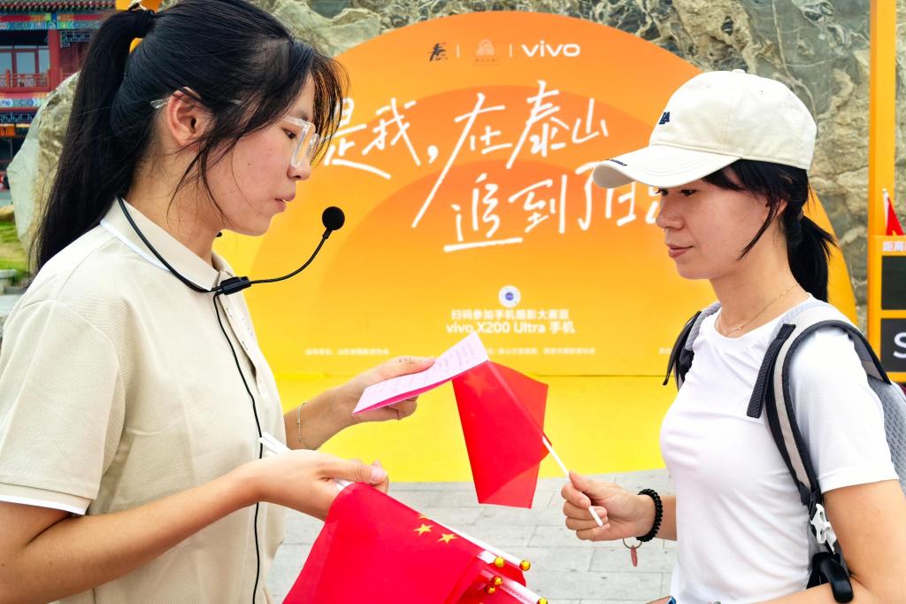在红门宫附近,团队成员以泰山挑山工肩扛重担、勇攀高峰的真实身影为生动素材,向游客生动讲述“坚韧不拔、脚踏实地”的挑山工精神,诠释中华民族奋斗不息的精神底色。登山盘道途中,团队成员为同行儿童讲解泰山历史文化,将爱国情怀融入实地实景。最后,全体队员与游客汇聚泰山之巅,齐声高唱《歌唱祖国》《我的祖国》等经典红歌,歌声响彻山峦,凝聚起深沉而动人的民族自豪感。