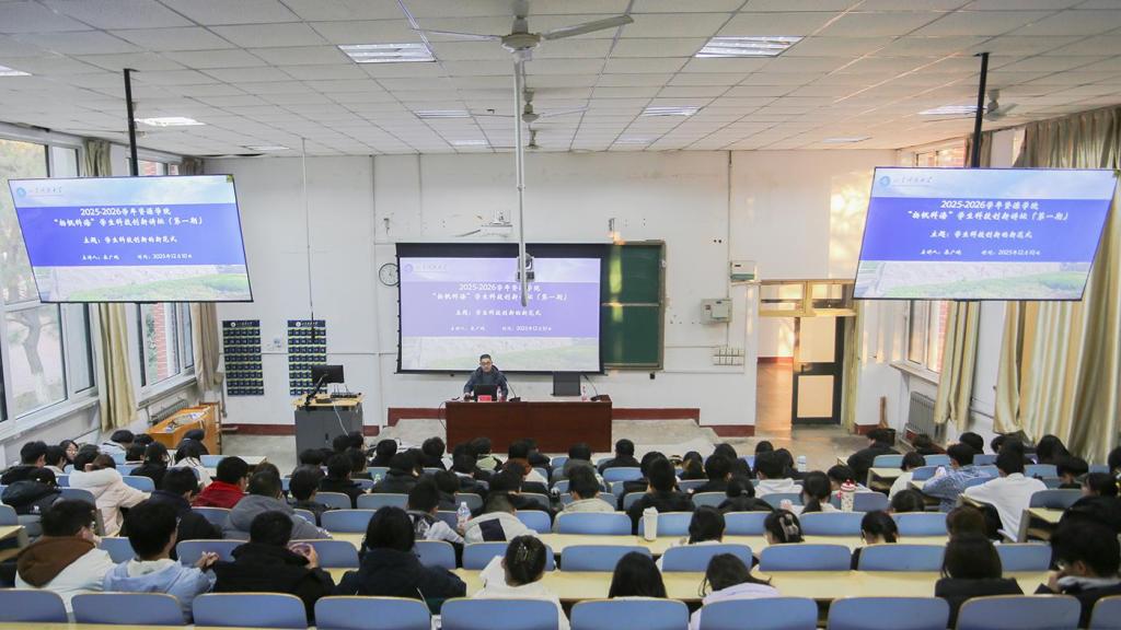在1A107教室举办“扬帆科海”学生科技创新讲坛。校科技处副处长兼校区科研管理办公室主任秦广鹏担任主讲人,2024、2025级学生积极参加。