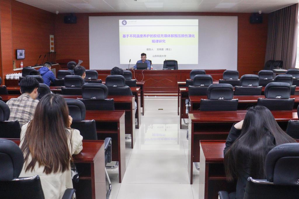 师生作“基于不同温度养护的胶结充填体卸围压损伤演化规律研究”学术报告。学院相关专业教师、研究生和部分本科生代表参加。